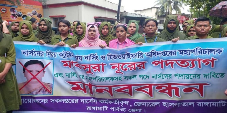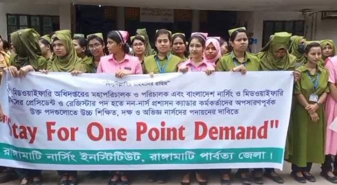 ঙামাটিতে নার্সদের বিক্ষোভ – নার্সিং ও মিডওয়াইফারি অধিদপ্তরে নন-নার্স কর্মকর্তাদের অপসারণ করে উচ্চশিক্ষিত, দক্ষ ও অভিজ্ঞ নার্সদের নিয়োগের দাবিতে মানববন্ধন …